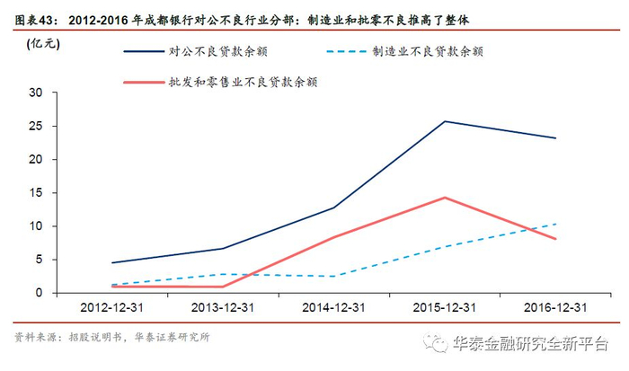 3) 贷款分布的行业因素。2013年末,成都银行贷款主要分布于制造业、批发及零售业和房地产业,三者分别占对公贷款的20.52%、18.63%、16.93%。2014年以来,随着宏观经济下行,产能过剩问题凸显,制造业的不良贷款显著增加;网络销售平台以其成本优势挤占了大量市场,纺织、服装及家庭用品、电子产品等批发零售企业销售收入大幅降低。2013-2015年,成都银行批发和零售业不良贷款由2013年底的0.95亿元增加至2015年底的14.28亿元,对公司的资产质量的下降贡献明显。2016年末,成都银行不良贷款中占比最高的行业为制造业,行业不良贷款占总对公不良贷款比例44.48%,其次为批发和零售业,占比34.81%。