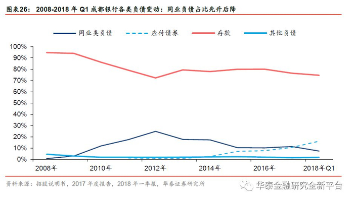 同业负债占比经历了上升和下降两个阶段,应付债券占比显著提升。2012年,同业类负债占总负债的比例一度高达近25%,在金融去杠杆的趋势下,同业负债滑落明显,截至2018Q1,同业类负债的比例为7.46%。应付债券的比例显著提高,截至2018年Q1,应付债券达688.53亿元,占总负债的比例为16.17%。