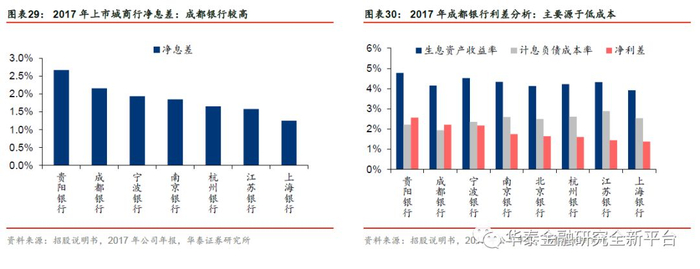 2017年成都银行净息差为2.16%,在A股上市银行中仅次于贵阳银行。从生息资产收益率及计息负债成本率两个角度来看,成都银行与贵阳银行高息差的原因有所不同。贵阳银行贷款客户中小微企业占比较高,因此生息资产收益率大幅高于其他城商行,同时计息负债成本率较低,因此2017年净息差高达2.67%。而成都银行高息差主要是因为低负债成本,2017年计息负债成本率1.94%,为上市城商行最低。但生息资产收益率仅排名上市城商行第五。