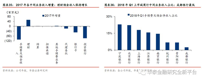 由于起步较晚,成都银行中间业务收入占比较低。2018年Q1,成都银行手续费及佣金净收入占营收的比例为2.44%,与其他城商行差距较大。2013-2016年,手续费及佣金净收入同比增速分别为72.3%、92.1%、34.5%和44.3%,但2017年有所收缩。2017年,手续费及佣金收入主要由理财业务、银行卡业务、代理委托业务及投资银行业务组成,四者分别占手续费及佣金净收入的35%、26%、12%和9%。2017年以前手续费及佣金收入快速增长主要来源于理财业务、代理委托业务和银行卡业务,其中2015年主要为银行卡业务,2016年主要为代理委托业务和理财业务。2017年手续费及佣金收入下降16.9%,仅理财业务收入正增长,增速为39.7%。