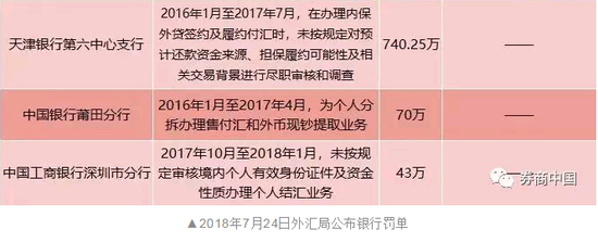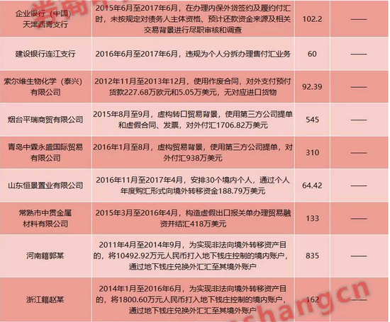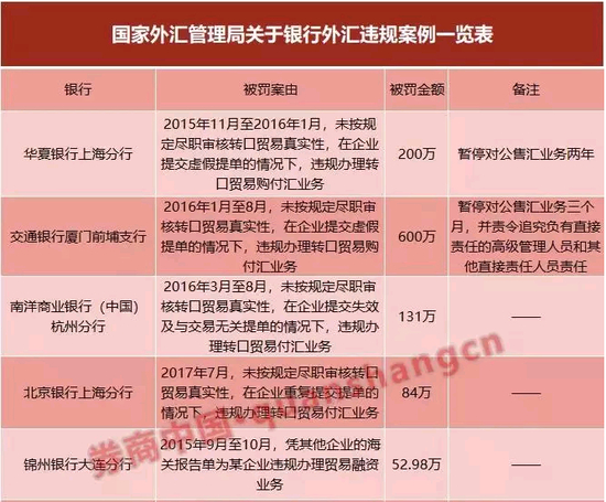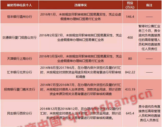 1,银行违规:违规办理转口贸易、内保外贷,违规办理个人分拆售付汇;