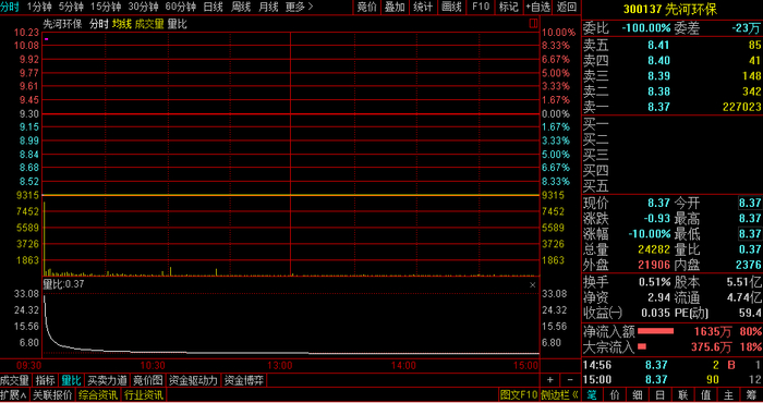 8月16日,先河环保开盘后即一字跌停,收报8.37元/股,跌幅10%。