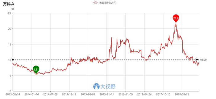 由上述得知,自2013年8月14日至2018年8月14日期间,万科的静态市盈率最高为21.6倍,最低为5.21倍,2018年最低股价对应的静态市盈率为8.21倍。