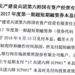 8月13日为17兵团六师SCP001(到期本息合计5.22亿元)的兑付日。当日晚间上清所公告,截至日终仍未足额收到发行人新疆生产建设兵团第六师国有资产经营有限责任公司(以下简称“六师国资”)支付的兑付资金(仅收到1.3亿元)。17兵团六师SCP001出现实质违约,成为第一例违约的城投债。8月15日中午,发行人六师国资将兑付资金打入上清所账户,违约危机暂时解除。