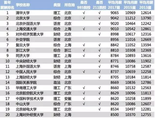 2018年中国大学毕业生薪酬水平排行榜