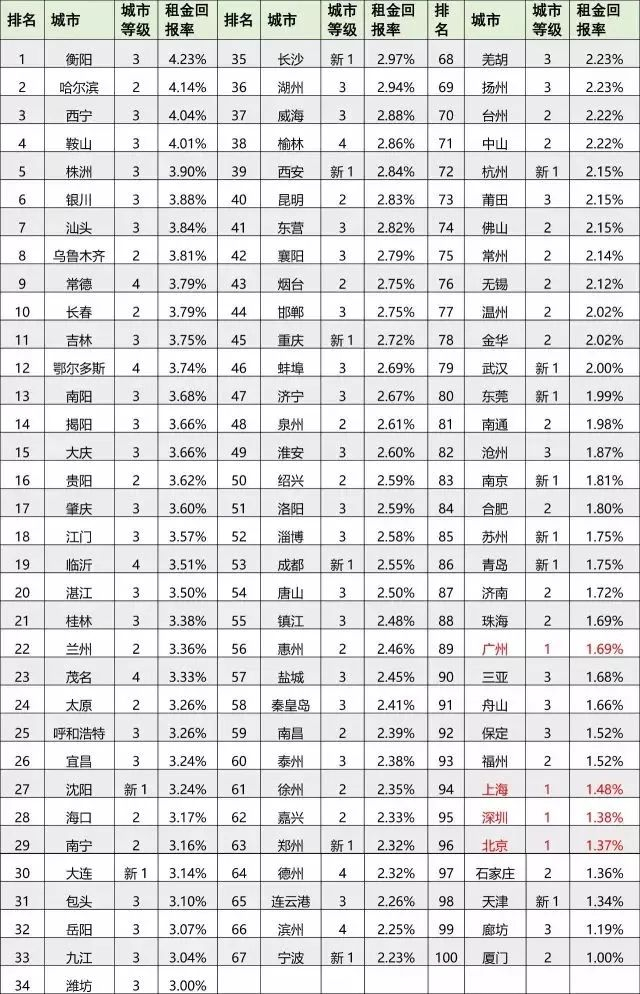 根据智谷趋势数据服务公司采集、整理的国内100座城市2017租金回报率数据,中国城市租金回报率与国外相比普遍较低。原因主要有两点:一是房价较高,二是租金水平比国外低。