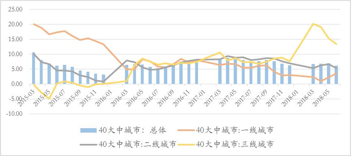 资金收紧的结果是房地产投资承压。上半年40个大中城市中除一线城市开发投资完成额累计同比有小幅上行外,总体和二三线城市均呈下行趋势,其中三线城市下降最为显著,从3月的20.19%降至6月的13.51%。一线城市开发投资涨幅上行主要是由于土地供应增加、地价上涨,导致土地购置费涨幅超过30%,成为拉动投资的主要因素。但从7月份的土地出让数据看,土地市场出现明显的分化,一线城市土地成交明显降温,土地出让金同比下降7%,成交面积大幅萎缩,同比减少36%,土地流拍数量创下2012年以来的新高,溢价率下行,可见一线城市土地市场逐步降温,正逐步回归理性。