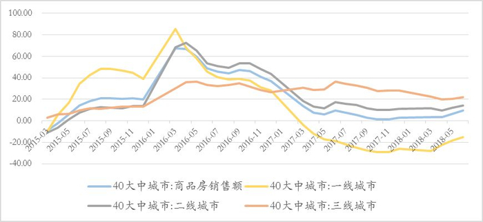 图4 40大中城市商品房销售额累计同比,一线城市交易较为冷清