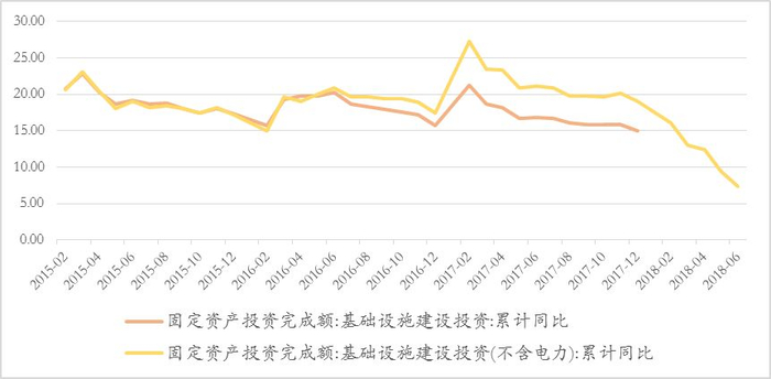 基建投资一直是稳增长的重要抓手,但上半年的基建投资并不给力,甚至出现断崖式下跌,不含电力的基建投资累计增速从去年的21.1%降至7.3%。主要原因是地方政府的融资渠道被严重堵塞,自国发43号文和新预算法出台后,政府债券成为唯一可行的“前门”,但并没有开多大的口子。2018年新增地方政府债券额度为2.18万亿,其中一般债0.83万亿,专项债1.35万亿,财政部对地方债的统筹安排于5月上旬公布相对滞后,导致上半年地方政府债券发行滞后,共发行地方政府债券1.41亿,相比去年同期的1.86万亿元下降24.18%。而且新增债只有0.33万亿,多为置换债和再融资债,很难满足地方政府新增融资需求,预算内资金在固定资产投资中仅占6%。另外,需要注意的是,今年新增债务额度多为专项债,上半年仅发行了0.30万亿,只使用了两成的额度,主要是财政部明确限定了专项债的资金使用范围,仅限于土地储备、收费公路、棚户区改造、轨道交通等自求平衡的公益性项目。