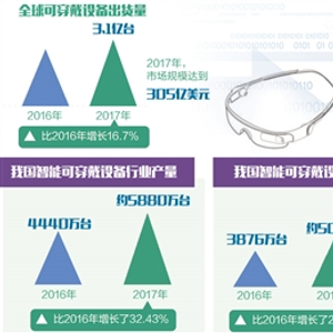 从全球市场看,2017年全球可穿戴设备出货量为3.1亿台,比2016年增长16.7%,市场规模达到305亿美元。智能可穿戴设备已在医疗保健、导航、社交网络、商务等领域推出了相对成熟的产品。从国内市场表现看,来自市场研究机构前瞻产业研究院的数据显示:去年我国智能可穿戴设备行业产量约5880万台,同比2016年的4440万台增长了32.43%;2017年我国智能可穿戴设备行业销量约5025万台,比2016年的3876万台增长了29.64%,预计2021年销售规模将会达到1亿台左右。