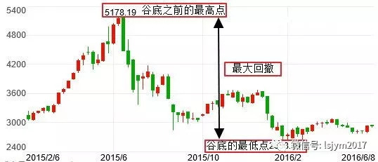 什么是最大回撤率呢?净值下跌出现一个谷底时,谷底的最低点与谷底之前的最高点之间的差值,通常用百分比来表示,这个数值就是最大回撤率。举个栗子,假设一只基金在2015年初上证指数3000点时,用3000元买入一份上证指数,然后一直持有至今。在2015年6月12日,账户净值达到高点5178元,然后净值开始大幅回撤,在2016年1月27日到达2638元,之后慢慢涨到今年1月底的3587元,现在净值又跌到了2700元左右。那么,这个基金的最大回撤是:(5178-2638)/5178=49.1%!