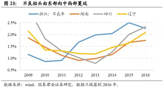 产业结构在地域上的分布短时间难以改变,因此当总需求不足引发经济下行时,我们很有可能再次看到不良率由东向西渐次抬头。从这一点看,东部地区(及银行)不良率也可作为很好的前瞻指标。