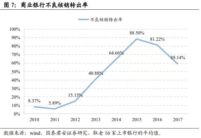 其中,重组贷款额的指标会披露在财报中,但因占比不高且已被纳入不良,关注度不高;核销和剥离主要体现在贷款减值准备中;清收一般以文字形式进行披露。我们通常以核销转出率(当期核销+转出/不良贷款均值),来考察银行处置不良贷款的力度。