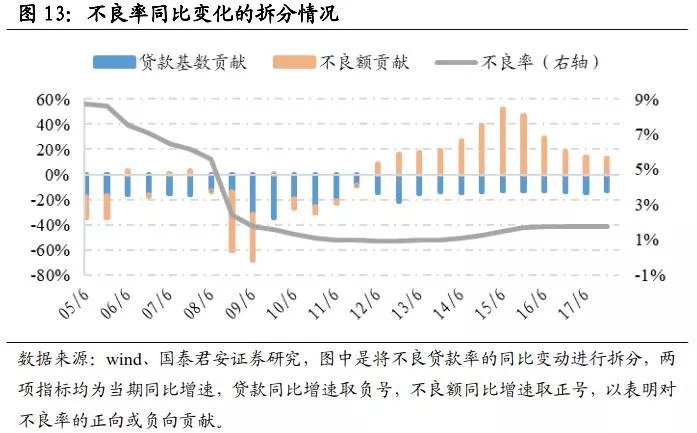 不良率的分母是贷款总额,因此在货币政策宽松、贷款投放上量的年份,尽管不良贷款还在暴露,不良率仍有可能下降。虽然这一问题对于以贷款总额做分母的指标而言都存在,但对于不良率来说,其周期性的特点更为明显。我们将历史的不良率同比变动拆解为分子(不良额)和分母(贷款基数)两部分,如下图: