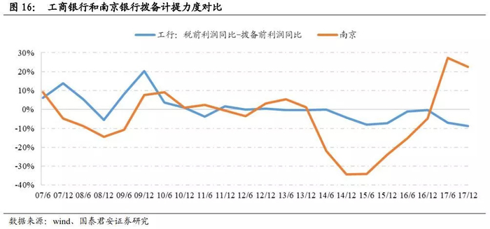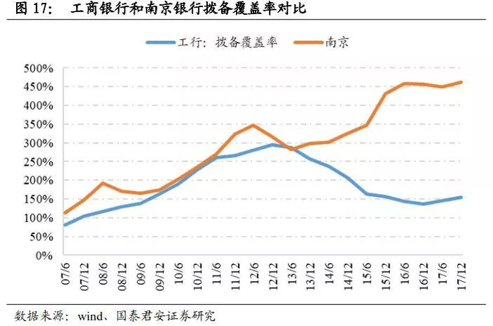 由图可见,在14年之前,两家银行拨备计提趋同,但自14年行业不良率抬头后,两家银行开始分化。南京银行计提力度非常大,对净利润的负向冲击最高超过30%,但厚实的拨备在17年开始反哺利润;工商银行的计提力度则是略微加大,在不良好转、部分银行已实现拨备反哺利润的17年,工行的拨备计提力度甚至还略高于14-16年。为何会有这样的差异?
