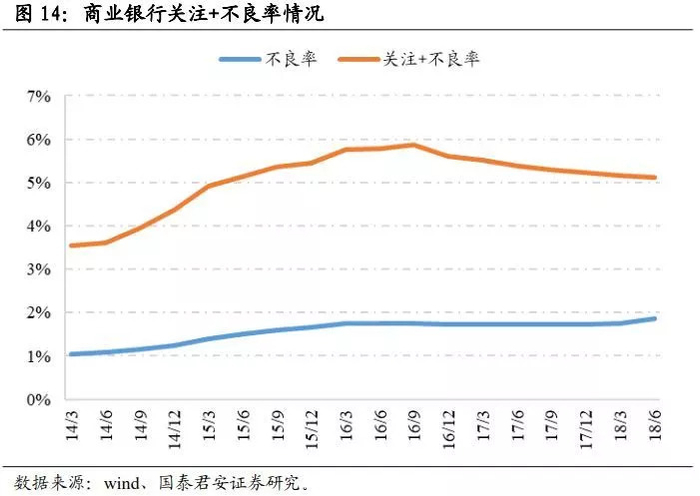由图可见,关注+不良率的波动性明显高于不良率。16年下半年至今不良率走平,但关注+不良率逐渐下行,说明银行资产质量开始改善。