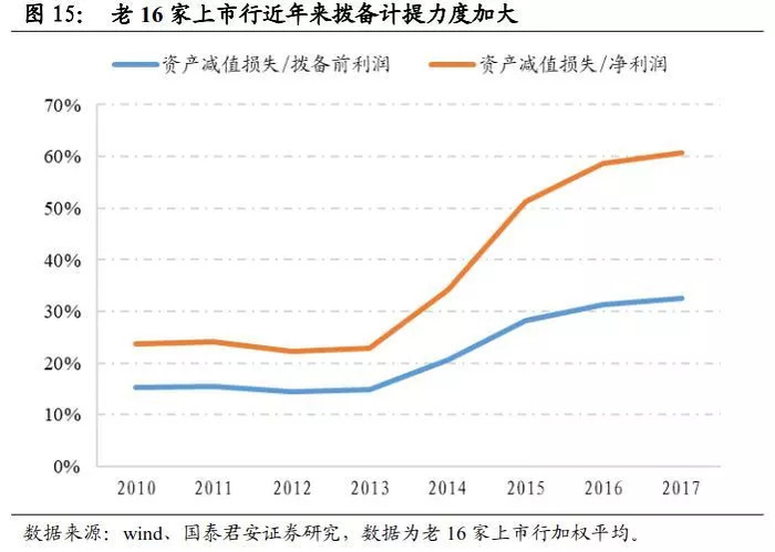 我们先直观看看资产减值损失能占到利润的几成,以评估其重要程度。其中,资产减值损失(计提拨备)直接来源于拨备前利润,因此这一比值可视作拨备计提力度。