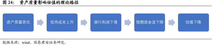 对绝对估值而言,资产质量恶化会降低未来现金流,或者提高折现率(提高了信用风险溢价),从而降低股价;对相对估值而言,资产质量恶化通过降低ROE,从而降低PB。
