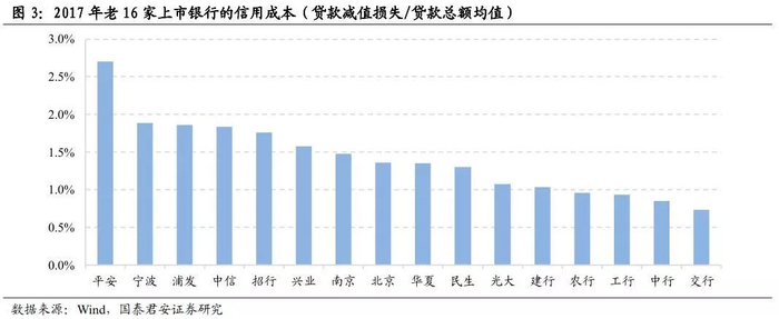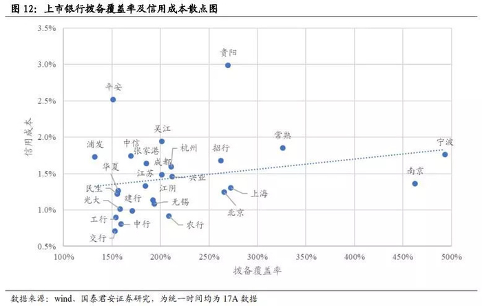 (1)拨备覆盖率低,信用成本低。这种情况往往是利润面临压力,通过较低的拨备计提力度,将拨备覆盖率维持在监管临界线位置,国有银行最为典型;