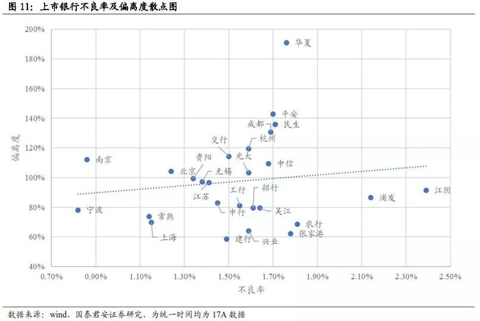 (3)不良率低,偏离度高。可理解为通过放松不良认定,掩盖部分不良。但这种操作往往是边际上的变动,总量指标难以观察到;