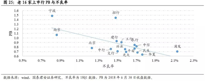 由下图可见,银行PB与不良率之间存在明显的线性关系,相关系数达到了64%。如果考虑近期市场风格而将宁波银行和招商银行剔除后,这个线性关系将更加明显。