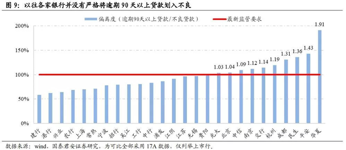 最后需要补充一点,偏离度小于1仅是指标表象,无法说明该银行就已经100%把逾期90天以上贷款划入了不良,因此可能有更多上市行受影响,上述测算应当被视作最低影响。