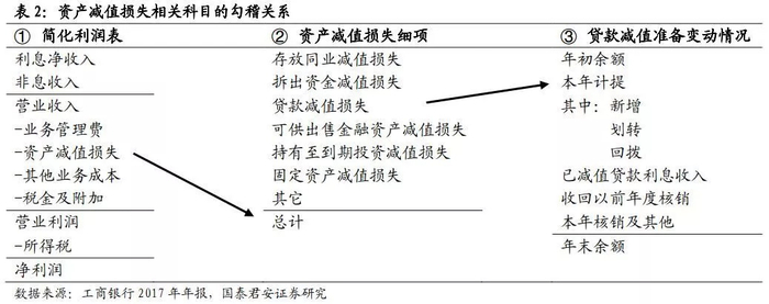 由借款人违约而导致的损失,体现在利润表中的“资产减值损失”一项,但这仅是利润表中最为简略的展示。由下表①②可知,资产减值损失是各类别资产各自损失的加总额,而某类资产减值损失,就是该项资产减值准备中的计提项(加项)。关于表③,我们将在下一小节展开分析。