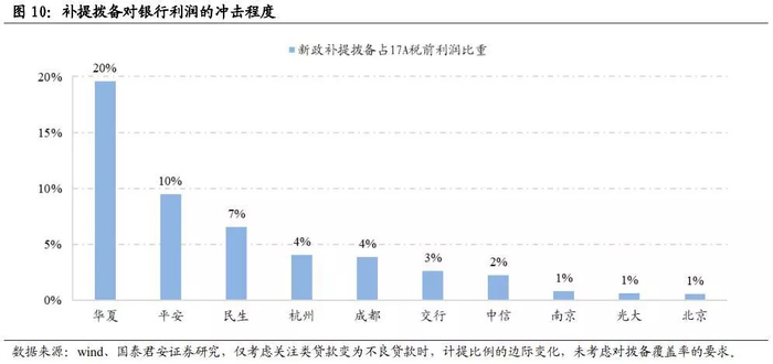 另一方面,不良贷款额的增加将稀释拨备覆盖率,同时由于贷款等级下降,面临监管要求的更高的拨备计提比例。这都将使得银行必须加大当期拨备计提力度,从而冲击利润。我们以监管要求的计提比例为例,算出对利润的冲击程度。