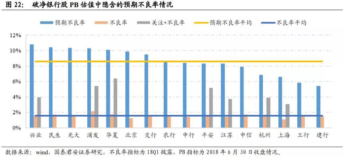 因此Y+Z=0.7X,我们便可求出当前PB下市场预期的不良情况。A股中破净银行股的预期不良率情况如下: