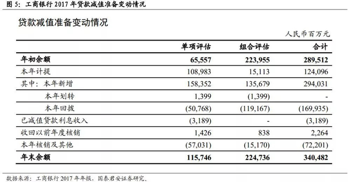 我们进一步考察贷款减值准备的变动情况,以工行17年年报为例。整张表适用BASE法则,即:期末余额=期初余额+增加值-减少值。