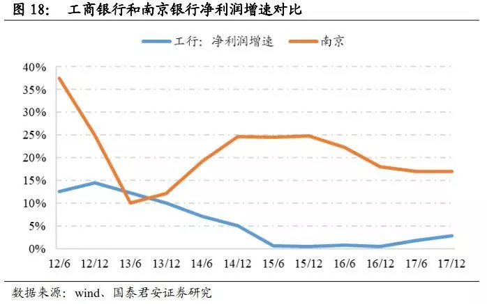 在了解了拨备计提的调整及限制后,我们最后考察二者的净利润情况。南京银行之所以没有在13年就加大计提力度,是为了托住快速下滑的净利润增速,随后在14年盈利改善时便多提拨备,17年增速放缓,拨备计提力度又相应下降了。可见,拨备计提确实起到了平滑作用。而工行在14-16年间选择消耗存量拨备,有可能是为了将净利润增速维持在正值而不得已的选择。