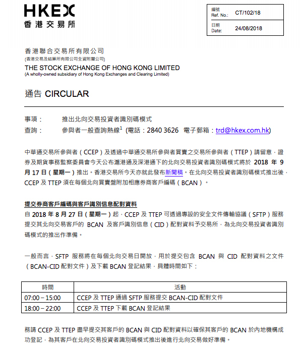 港交所方面表示,北向交易投资者识别码模式规定,提供北向交易服务的交易所参与者须按标准格式,为每名北向交易客户编派一个券商客户编码(BCAN),并向香港交易所提供客户识别信息(CID),香港交易所会将有关信息交予内地交易所。当投资者提交北向交易买卖盘时,必须全部加上适当的券商客户编码。