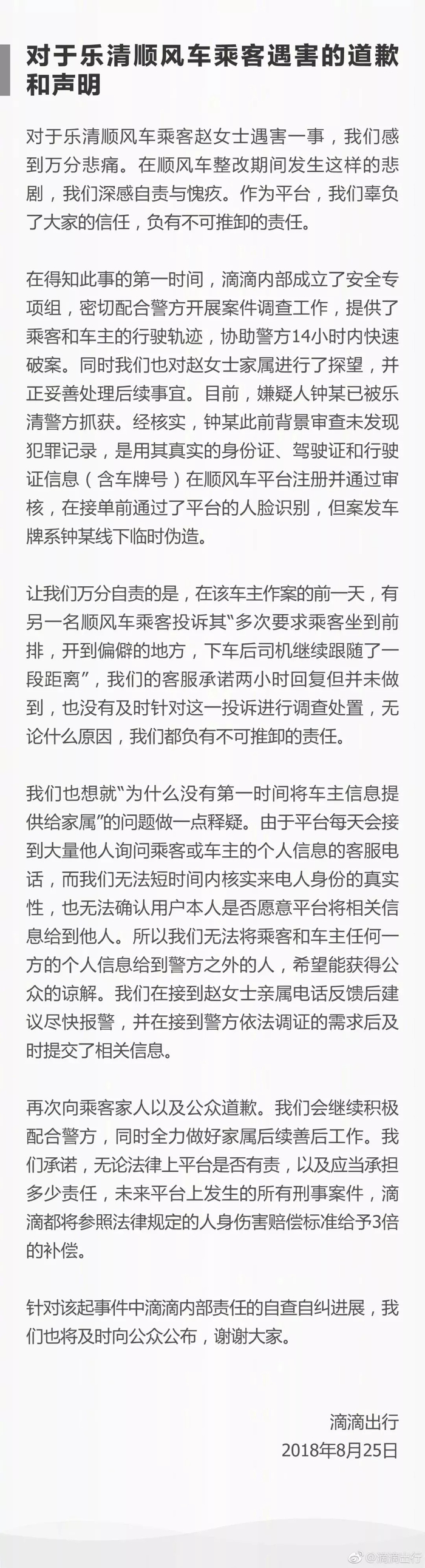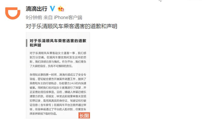 5月,空姐遇害案引起广泛关注后,滴滴曾对顺风车及快车服务等进行了整改,并在微博平台进行公示: