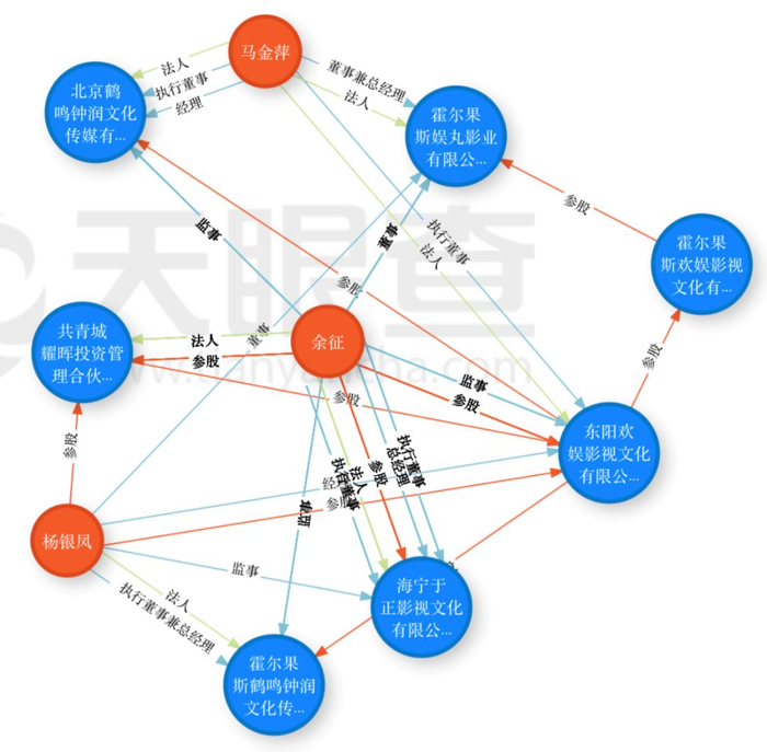 欢娱影视的法定代表人为马金萍,据媒体报道为于正母亲。马金萍同时在北京鹤鸣钟润文化传媒有限公司、东阳欢娱影视文化有限公司北京分公司、霍尔果斯娱丸影业有限公司、海宁欢娱影视投资有限公司任法定代表人。于正的重要商业合作伙伴杨银凤,在多家于正投资的企业中任高管。