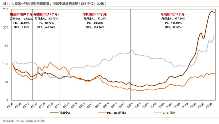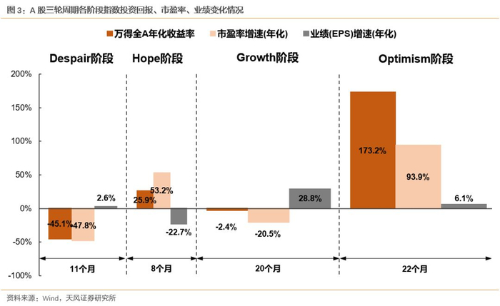 数据上看,这一轮周期中各阶段万得全A指数的涨跌幅分别为-35.12%、-12.10%、-33.21%和477.30%,乐观阶段录得明显上涨;四个阶段估值调整幅度分别为绝望阶段下跌43.07%、希望阶段上涨42.77%、增长阶段下跌69.98%、乐观阶段上涨154.03%,业绩在四个阶段调整幅度分别为2.93%、-40.30%、124.96%和39.95%。