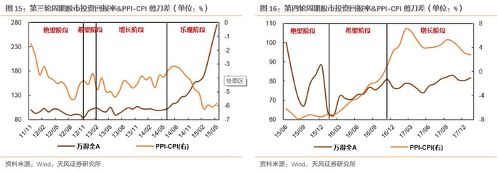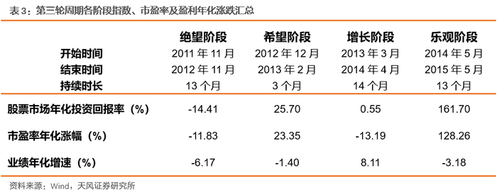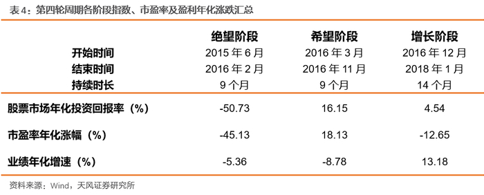 第四轮周期共持续32个月,其中增长阶段持续14个月,绝望和希望阶段分别持续9个月。本轮周期的绝望阶段,由于估值和企业盈利“双杀”,股市年化投资回报率取得较大幅度负增长;而到了希望阶段,随着投资者预期的好转,市盈率转向正向增长,股市投资回报率转负为正。从目前增长阶段的情况来看,企业盈利已度过绝望阶段和希望阶段持续下行,重回增长轨道,但受制于估值中枢的下调,阶段内指数走势仍比较平稳。
