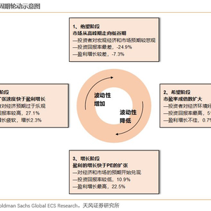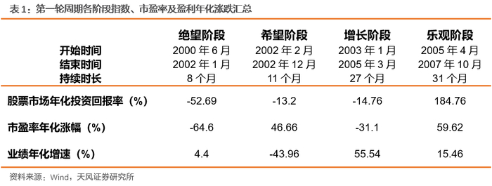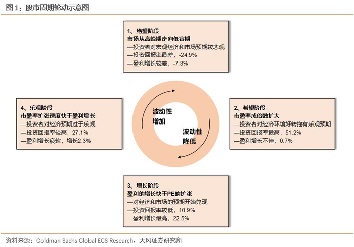1、根据业绩和估值的趋势,一轮完整的股市周期分为“绝望→希望→增长→乐观”四个阶段。其中,希望和乐观阶段受估值驱动,股票市场涨幅较大;增长阶段的上涨主要受盈利驱动,但涨幅相对小;绝望阶段由于估值、业绩双杀,股票市场也基本处于下行期。