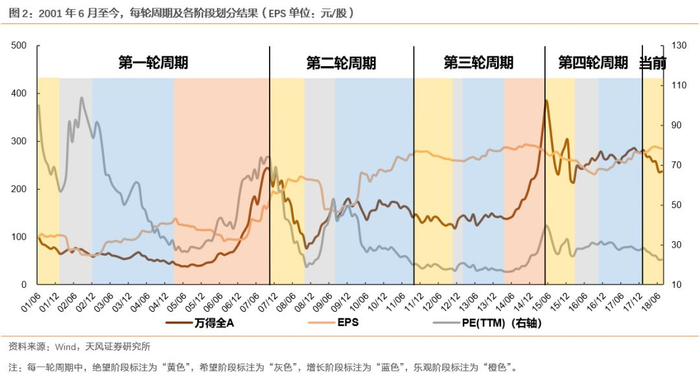 从我们的统计结果来看,2001年6月至今,A股市场已经历四轮股市周期,分别为:2001至2007年的第一轮周期,2007至2011年的第二轮周期,2011至2015年的第三轮周期,2015至2018年的第四轮周期,目前,市场或已迈过第四轮周期并过渡至第五轮周期第一阶段。
