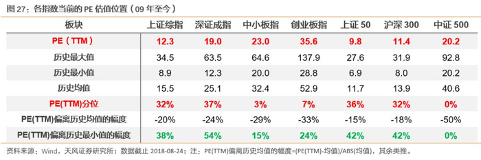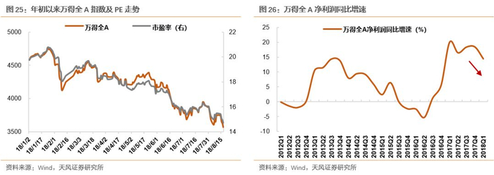 回归到当前,上半年来,在贸易战和去杠杆的影响下,A股市场再度出现持续下跌,对整个市场的情绪也造成了较大的负面影响。从今年1月至今,万得全A指数和估值中枢再度下移,成分股公司业绩也出现结束了此前持续提升趋势,开始出现下行。基于此我们认为,当前的A股市场可能已经进入第五轮周期的绝望阶段。