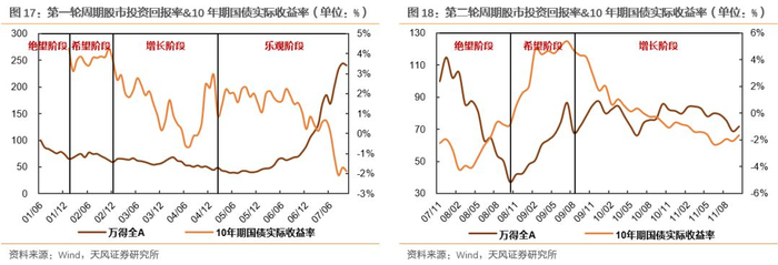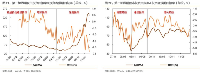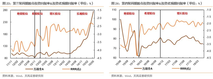 从数据结论来看,后两轮股市周期RRR走势与预期结论基本接近,而前两轮则出现一定的背离,具体表现为这两轮周期的增长阶段,投资者预期回报率均出现不同程度的下行,而从前文我们整合的数据可以发现,这两个阶段中反应投资者预期的PE下行幅度明显大于其余两轮周期的增长阶段,也对期间内指数的上涨形成明显拖累。由此可以看出,这两个增长阶段,尽管企业业绩的表现的确比较瞩目,但市场上投资者信心仍显得不足。
