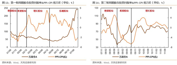 我们在第二部分对股市周期各阶段三大变量的演变特征的描述中已经提到,在不同的阶段,上市企业盈利往往面临不同趋势。对应到这一部分,我们认为PPI-CPI剪刀差走势基本与上市企业盈利一致,具体而言为:绝望阶段,由于企业盈利增长较差,PPI-CPI同比逐渐下行直至为负;希望阶段,企业盈利尚未好转,但由于正在向增长阶段过度,因此该剪刀差逐渐上行直至由负转正;增长阶段,PPI-CPI剪刀差将持续攀升至高位;乐观阶段,由于盈利增速转为疲软,PPI-CPI剪刀差将逐步下行。