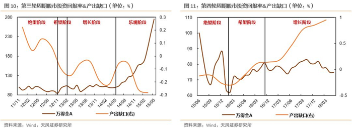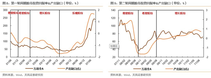 对应到股市周期的各阶段:1)绝望阶段前期,市场对经济的预期普遍悲观,产出缺口往往会扩大;而后期向希望阶段过渡过程中,市场的悲观情绪不断被缓和但实际经济情况尚未明显好转,产出缺口由此收窄。2)希望阶段的实际经济指标通常为最差水平,但人们始终存在对未来经济改善的预期,产出缺口将继续下降。但到该阶段即将结束时,宏观经济逐步向好,届时产出缺口将逐渐走出谷底。3)增长阶段实际经济的增长超过潜在水平,产出缺口将急剧上升。4)乐观阶段是实际经济水平达到峰值的一个阶段,这个阶段中,无论是实际GDP增长还是潜在GDP预期都相对强劲,因此产出缺口的变动并无明显规律。