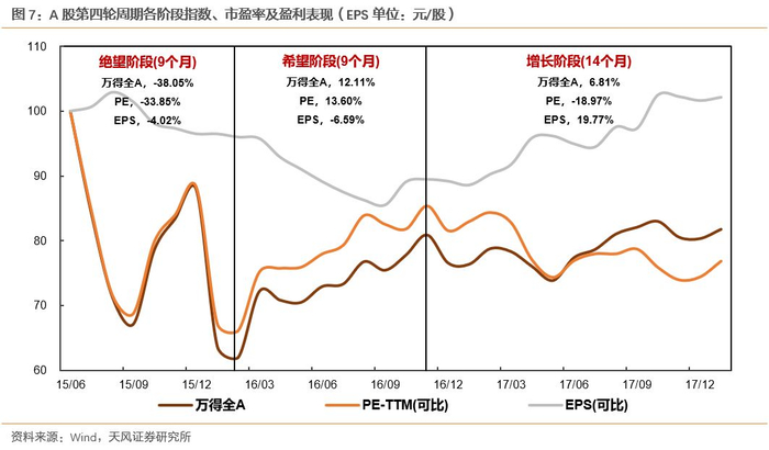 2015年6月在股市强力去杠杆的政策作用下出现了股灾,A股经历了1990年以来最大规模的断崖式下跌并开始了长达半年的深度调整,市场估值水平快速下行,与此同时,随着经济持续通缩,工业企业盈利增速下行扩散到万得全A指数,盈利开始呈下行趋势。这一过程持续至2016年2月,就是所谓的绝望阶段。在该阶段,万得全A收益率为-38.05%,估值和业绩分别下降33.85%和4.02%。