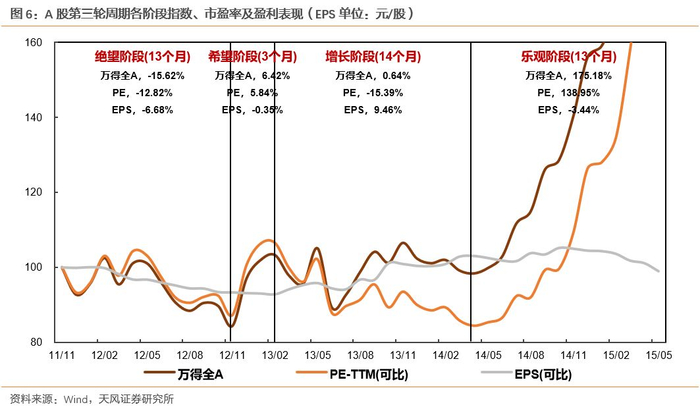 进入到本轮周期的乐观阶段(即2014年)之后,国内经济实际下行压力较大,但同时由于货币环境较宽松,大量资金无法从实体经济中获得满意的回报,开始在金融市场轮动。这一阶段,企业盈利增速相对放缓,而股票指数则在杠杆加持下一路涨至历史最高位。该阶段万得全A指数收益率高达175.18%,其中估值上涨138.95%,业绩上涨15.16%。