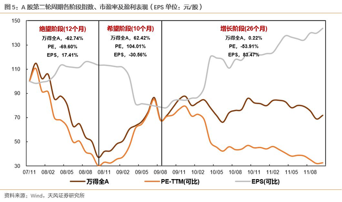 此轮周期的初期,受08年全球金融危机影响,投资者对经济前景的预期较为悲观,反应到股市上可以看到,07年11月到08年10月这一段时间,尽管企业盈利并未大幅下降,但整个股指仍一路下探到底部,即为绝望阶段。这一阶段中,万得全A收益率为-62.74%,其中估值下调69.6%,业绩上涨17.41%。