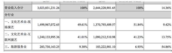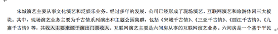 在最新公布的半年报中,营业总收入为15.11亿元,主要来自现场演艺、互联网演艺和旅游休闲三大板块,其中现场演艺业务主要为千古情系列演出和主题公园集群,收入主要来源于演出门票收入。