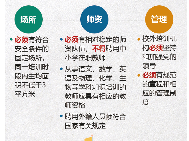 校外培训机构不得一次性收取时间跨度超过3个月的费用。师资条件方面,校外培训机构必须有相对稳定的师资队伍,不得聘用中小学在职教师。从事语文、数学、英语及物理、化学、生物等学科知识培训的教师应具有相应的教师资格。校外培训机构必须经审批取得办学许可证后,登记取得营业执照(或事业单位法人证书、民办非企业单位登记证书),才能开展培训。……