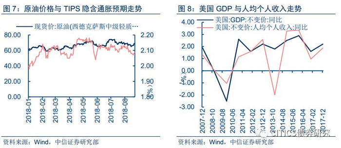 短端利率方面,当前2年期国债收益率为2.63%,基本已反映了美联储9月的加息预期,如果基准利率上升到2.50%,2年期国债收益率会继续上行,逼近目前十年期的国债收益率2.82%,10年-2年期限利差将会逼近0或者发生倒挂。因此,美国国债收益率曲线将趋于平缓。