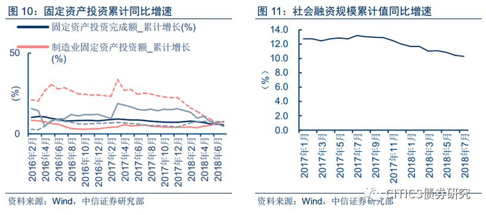 经济基本面存在韧性,经济增速放缓,固定投资和社融增速下滑,在财政发力下基建有望企稳。从经济基本面来看,2018年上半年GDP同比增长6.8%,维持在6.7%-6.9%区间,7月CPI同比增速2.1%,PPI同比增速4.6%,通货膨胀压力不大。1-7月固定投资增速持续下降,虽然房地产业和制造业固定资产投资增速有所回升,但由于今年基建项目受到合法合规性审查、PPP项目受到清理规范等监管,基建投资增速呈现大幅下降。在积极的财政政策指导下,中央政治局会议提出加大基础设施领域补短板的力度,财政部于8月14日发文要求地方专项债发行提速,随着政策的落地、项目的推行,下半年基建投资有望企稳。社融方面,今年以来社融增速放缓,尽管央行通过定向降准、公开市场操作等进行流动性投放,并通过扩大MLF担保范围、窗口指导等措施支持银行加大信贷投放力度、打通货币政策传导机制,信贷投放在7月有所回升,但是由于表外非标融资的收缩,社融增速仍保持下降的趋势。