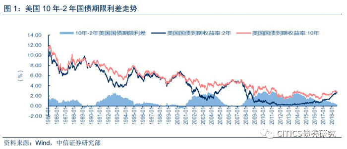 近期,中美国债期限利差呈现不同走势,美国国债收益率曲线利率中枢上行,期限利差收窄,10年-2年美债国债的期限利差跌至19个bp,中国国债收益率曲线利率中枢下行,期限利差扩大,10年-3个月中债国债的期限利差由6月底的40个bp上升到145个bp。期限利差作为预测未来宏观经济的先行指标,可以较好的预测未来1年的实际经济增长率与通货膨胀率:期限利差走阔,预示未来一年经济增长的加快;而期限利差的收窄,往往预示经济增长放缓。本轮中美期限利差截然不同的走势,主要是和两国处于不同的经济周期,采取不同的货币政策等原因有关。